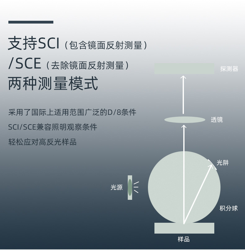 測量結構 | D/8-SCI+SCE,(漫射照明,8°方向接收),包含鏡面反射光去除鏡面反射光) | ||