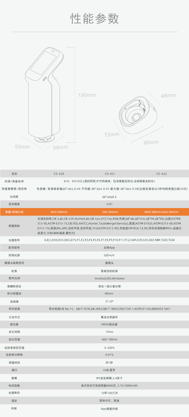專業版分光色差儀CS-420開拓色差儀測色新技能;內置攝像頭,想測哪里測哪里;配帶UV光源,實現熒光色測量;連接手機APP,數據測量、存儲不受限,多套色卡信息,隨時隨地查找相近色;還可使用APP進行配色、修色功能。CS-420型號測量口徑為8mm,滿足大部分尺寸樣品測量。