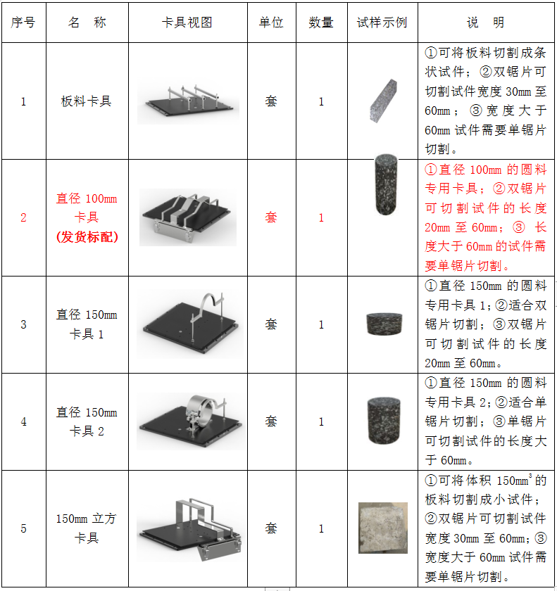 特別說明:序號3、4的試件切割卡具和鋸片切割墊塊為本儀器出廠標準配件,用戶的特殊需求試驗器具可根據本說明書附錄“儀器試驗器具”的介紹另行選購